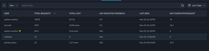 The users tab provides an overview of the user information associated with your Portkey requests. This data is derived from the user parameter in OpenAI SDK requests or the special _user key in the Portkey metadata header. Portkey currently does not provide analytics on usage patterns for individual team members in your Portkey organization. The users tab is designed to track end-user behavior in your application, not internal team usage.