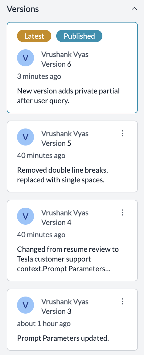 • Update: When you edit a prompt, changes are saved as a new version but not pushed to production